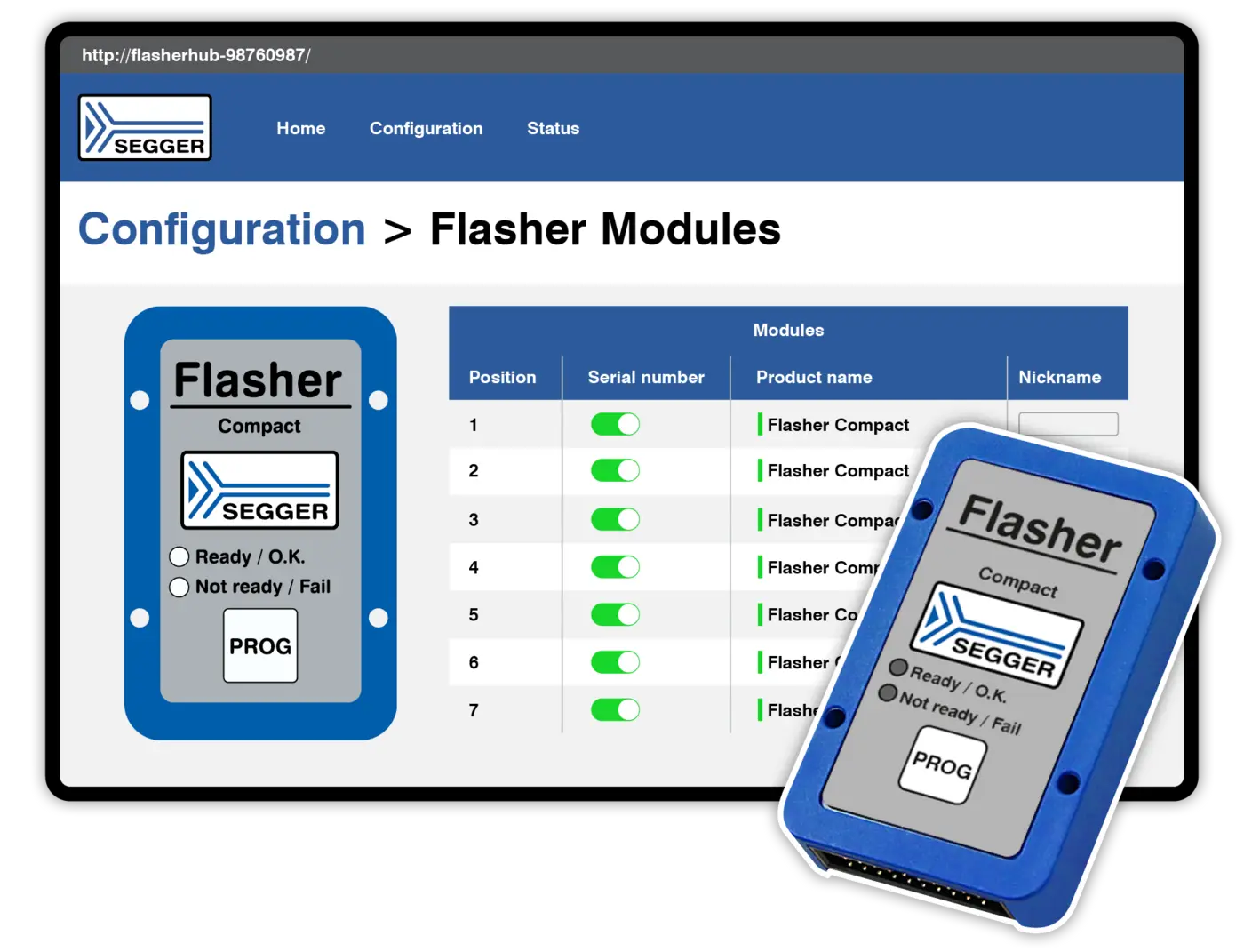 The Flasher Hub-12/Flasher Compact system is set up just once per channel using SEGGER's Flasher software package. The software depends on the type of flash chip being programmed. The Flasher Hub-12 can receive commands and send results"stand-alone" via TELNET, a desktop PC is not required for control.